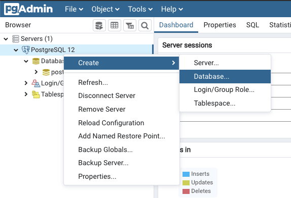 Third, right-click the PostgreSQL 12 and select Create > Database.. to open a dialog for creating a new database.